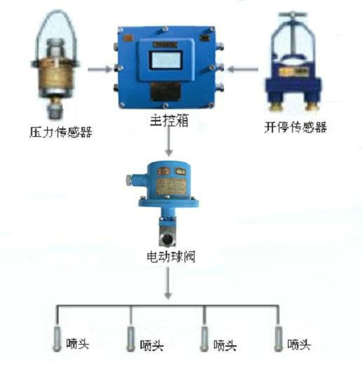 主控箱安裝在采煤機機頭位置,接AC127V電源。電動球閥串接在水幕與進水管之間。水壓傳感器安裝在灑水噴霧的水路中,開停傳感器安裝在采煤機動力電纜上(或?qū)⒐饪貍鞲衅靼惭b到采煤機工作燈的上方)。